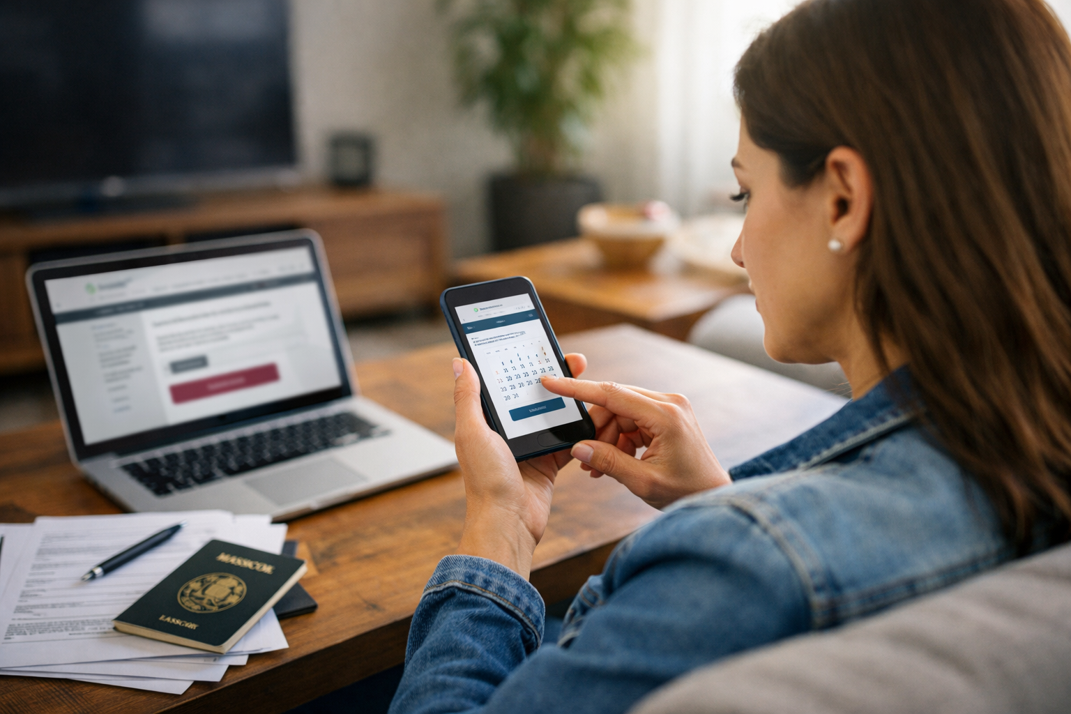 Mujer registra sus huellas digitales y fotografía en una oficina del Registro Civil de Sonora, con paisaje desértico y edificios modernos al fondo.